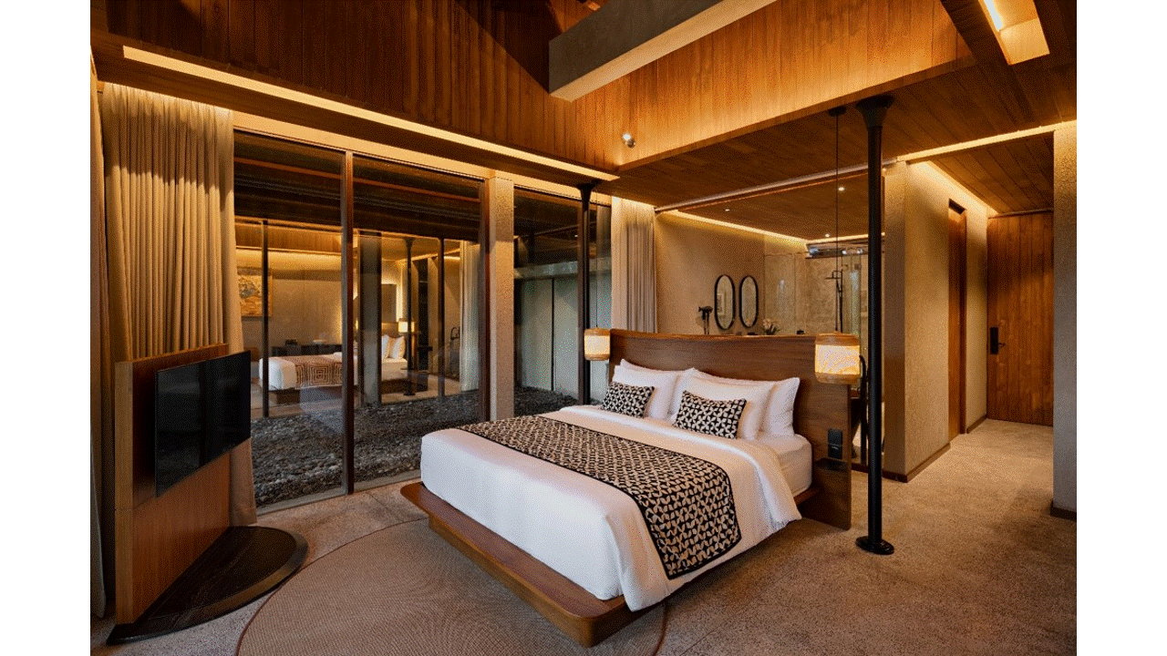 the hotel design applies the concept of tropical hospitality. the concept blends contemporary comfort with natural and local elements, creating a space that feels warm, calming, and deeply connected to its surroundings. with its concept, the guest rooms are designed to dissolve the boundary between interior and the surrounding landscape. the tropical atmosphere is felt through the room layout that connects with the surrounding nature—dense jungle forest and the glistening pool. the design emphasizes the use of natural materials, which bring a sense of authenticity and the richness of natural earth tones into the room. the subtle accents enhances the relaxing atmosphere while maintaining a refined and elegant look.