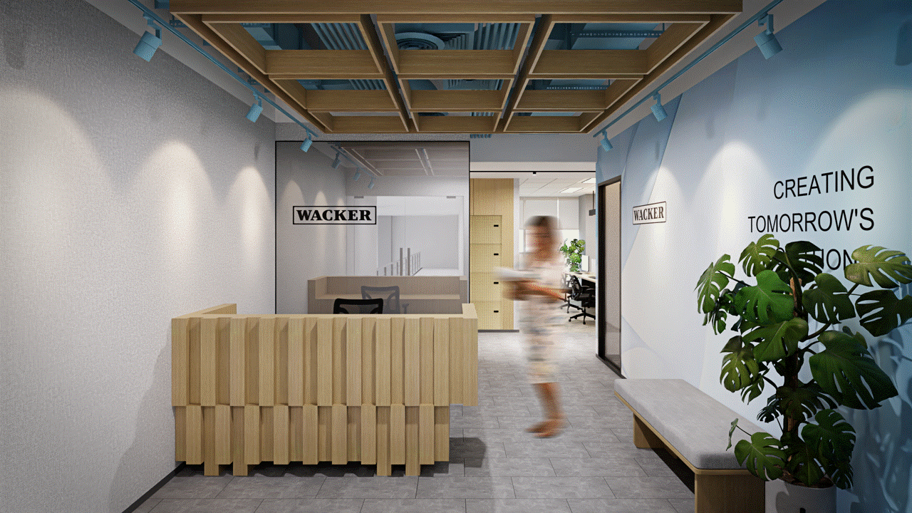 as a German multinational chemical company operating in Indonesia, this design concept is shaped around values of contemporary workplace design, sustainability, and technical excellence complemented by local materials and traditional craftsmanship as cultural anchors within the space. the design embraces WACKER’s identity through a functional and clean spatial layout that encourages openness, experimentation, and knowledge exchange. recycled wood and local materials are thoughtfully incorporated, while elements of traditional craftsmanship reinforce cultural authenticity and reflect WACKER’s sustainable and regional presence in Indonesia.